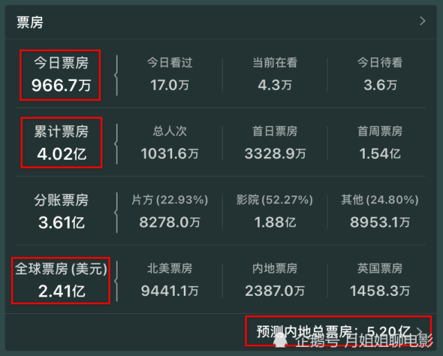 这部电影的口碑不错,豆瓣还剩下7.8分,猫眼预测票房再次提升,达到了5.2亿。该片并不属于较有深度内容的电影,而是以游戏为基础,精彩的特效视觉效果,加上搞笑的剧情和笑点,从而形成了一部爆笑喜剧。这部电影有希望还能热映一周的时间,但中秋档电影即将来袭,届时排片量必然会大受影响,最终票房基本也只能在5亿左右。