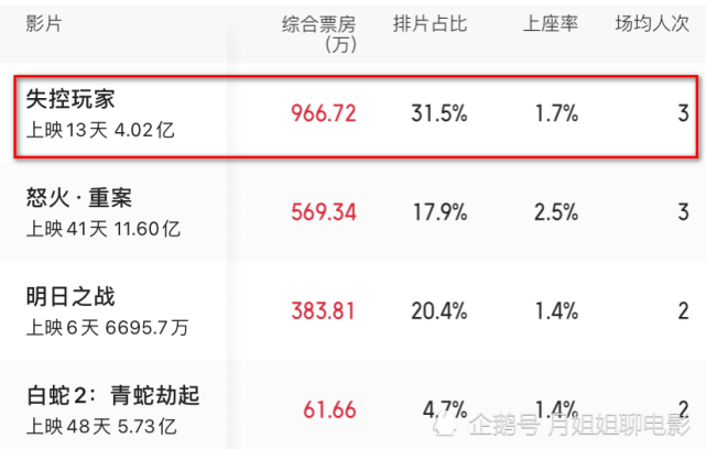 《失控玩家》在8月27日上映,一部电影正常热映的周期为1个月。在国庆档来临之前,该片基本上也就到了下映的时刻,最终票房预计也就在5亿左右。