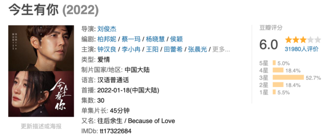 再看另一边《今生有你》,豆瓣6.0分。不能说差,但作为剧集,这个分数绝对算不上好。