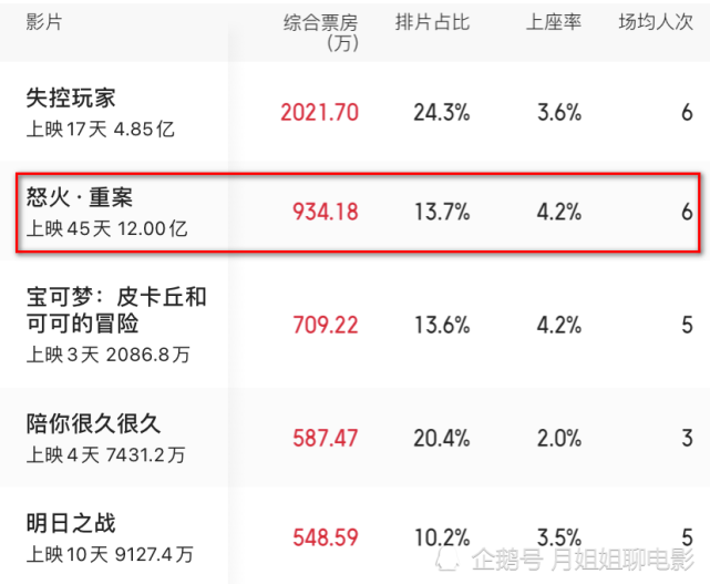《怒火·重案》的后劲依旧十足,虽然已经上映了45天,但排片量依旧还有13.7%,上座率为4.2%,排在热映电影中的前列。截止到目前为止,《怒火·重案》的单日票房超过了900万,排在第二名。