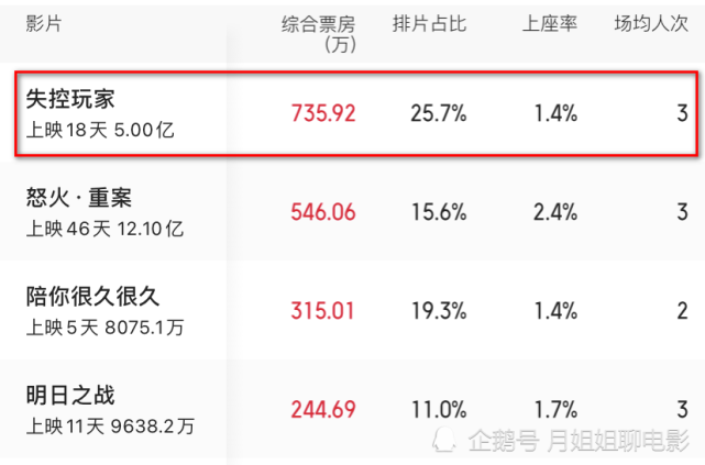 《失控玩家》的上座率已经持续走低,在《峰爆》上映之后,这部电影的热度显然会明显下降,排片量很可能直接降至10%左右。
