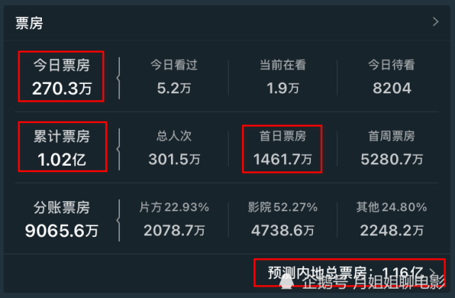 这部电影在猫眼上的预测票房成绩仅为1.16亿,这个预测票房成绩基本相差不会很大。因为中秋档电影很快就要上映,其中,《峰爆》有着极高的热度,点映的口碑不错。