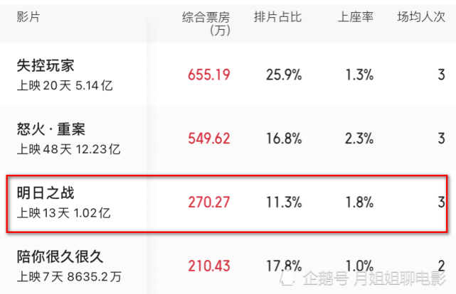 《明日之战》票房破了1亿,可喜可贺!这部电影已经放映了13天,依旧有着不错的热度。但单日票房始终都不高。该片首日票房成绩为1400多万,这个成绩并不好。这主要是因为《失控玩家》和《怒火·重案》的热度和口碑更好,从而让《明日之战》一直都无法获得更多的排片量。