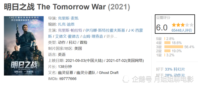 《明日之战》豆瓣还剩下6分。这个分数很低,但基本符合影片的质量。电影的剧情很流畅,演员的演技也在线,但不少剧情却经不起推敲。影片的最大看点就是特效带来的视觉效果。