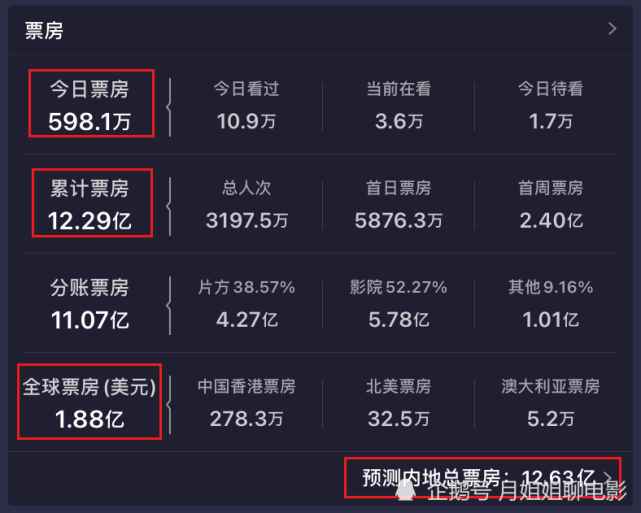这部电影在猫眼上的预测票房成绩为12.63亿,依照目前的热度来看,这部电影本可以获得更多的票房收入,但由于中秋档和国庆档电影都将来袭,这也让该片已经很难获得更多的票房收入。