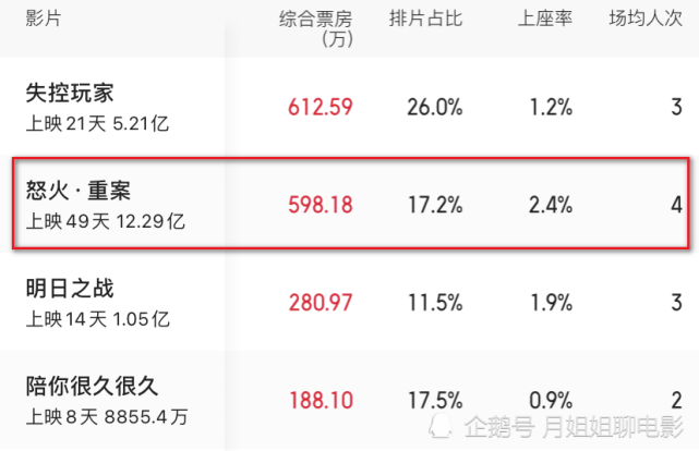 《怒火·重案》累计票房已经达到了12.29亿。这部警匪港片仍有不错的热度。该片是陈木胜导演的遗作,有着不错的口碑。目前已经放映了49天,单日票房再次获得了近600万,排在实时票房榜单第二名。