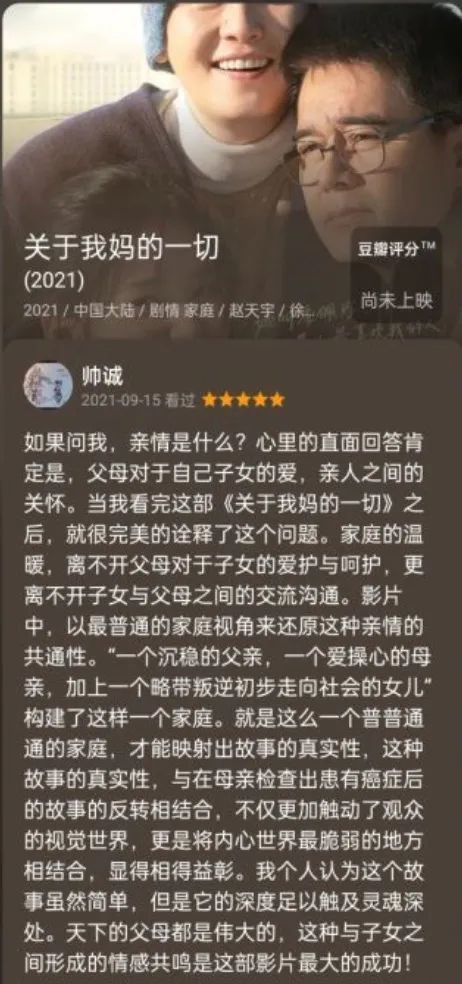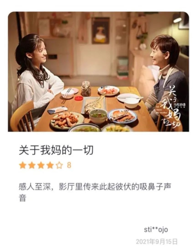 有观众哽咽分享道:“两个小时的电影,哭了一个半小时。季佩珍是最真实的“国民妈妈”,仿佛看到了自己和妈妈的日常生活。看完电影,好想妈妈,中秋要回家带妈妈再看一遍电影。”