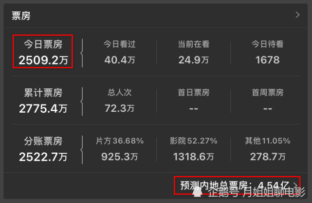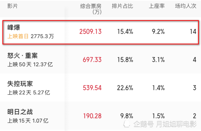 该片在猫眼上的预测票房成绩为4.54亿。这部电影的首日票房成绩其实并不高。因为近期还有两部电影有着不错的热度,那就是《失控玩家》和《怒火·重案》,这也就导致了《峰爆》并没有获得理想的排片量,从而影片的首日票房收入并不是很高。