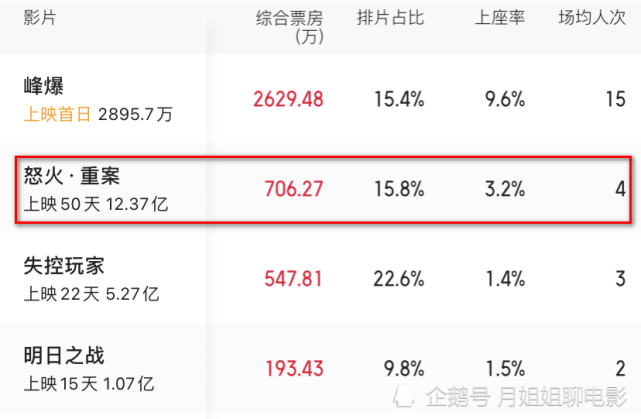 《怒火·重案》已经放映了50天,依旧有着不错的热度。影片的排片量超过了15%,单日票房超过了700万,累计票房达到了12.37亿。该片在猫眼上的预测票房达到了12.9亿。这部电影的排片量远低于《失控玩家》的22.6%,但上座率达到了3.2%,单日票房成绩逆袭了《失控玩家》,排在单日票房榜单第二名。《峰爆》已经正式上映,虽然夺得了日票房冠军,但口碑一般。