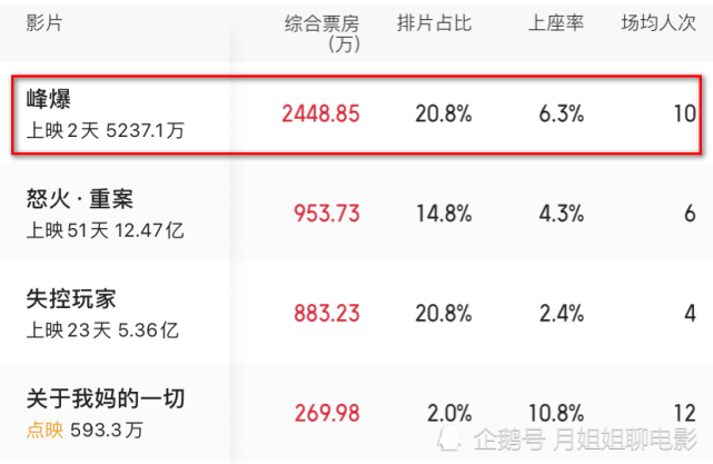 《峰爆》的排片量为20.8%,与《失控玩家》并列第一,但上座率要高于后者。《峰爆》的上座率为6.3%,排在前三热映电影中的第一名。