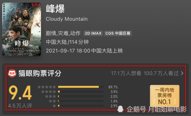 《峰爆》在猫眼上的评分为9.4分。影片在点映时,猫眼打出了9.5分。分数基本没有太大的变化。豆瓣评分暂时还未出,但预计并不会很高,基本会在7分左右。