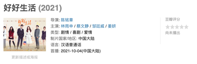 这个剧也官方定档了,10月4日开播,林雨申与蔡文静等共同出演。
