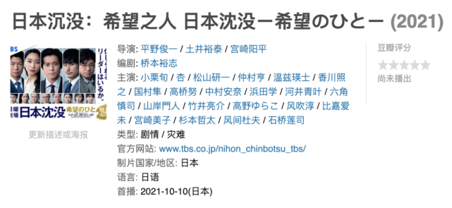 嗯,日本人又开始拍《日本沉没》了,而且,阵容还怪强的。看下演员阵容,一堆熟脸,小栗旬、杏、松山研一、仲村亨等等共同出演。