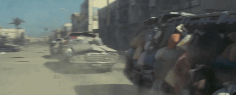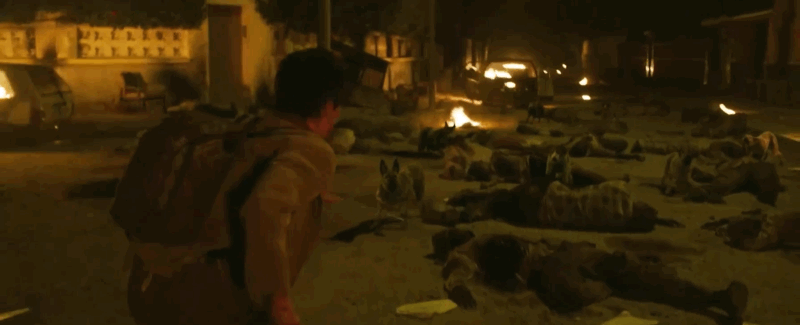 一路上尸横遍野,畸变长镜头在车内外来回穿梭,和人物同一水平线的视角让一切像一场真人CS一样,极具临场感。