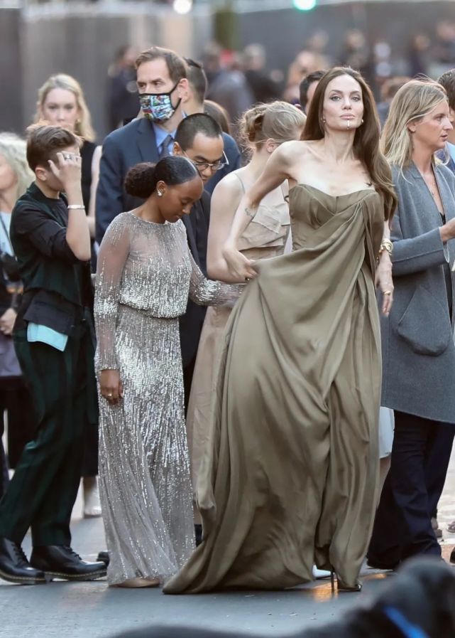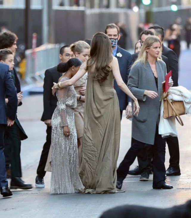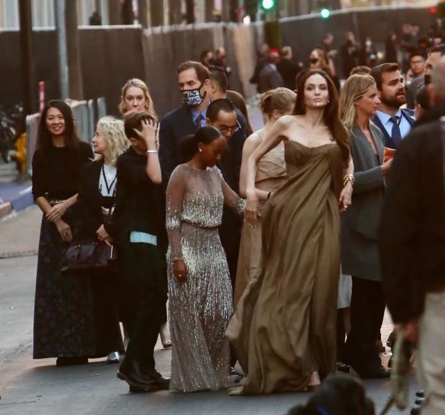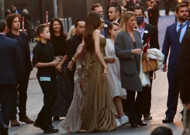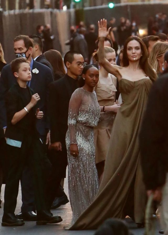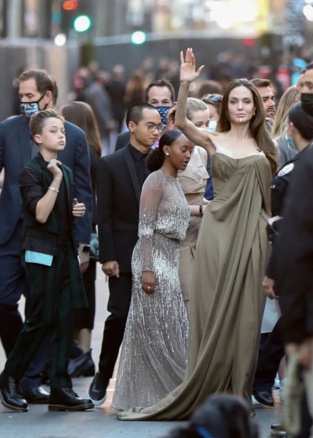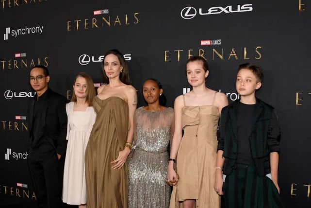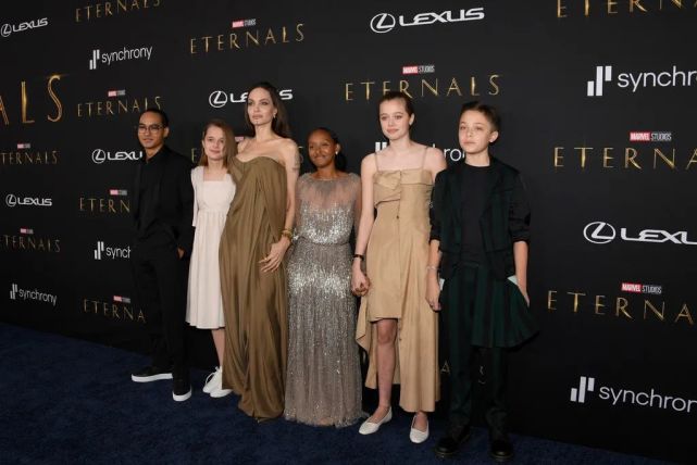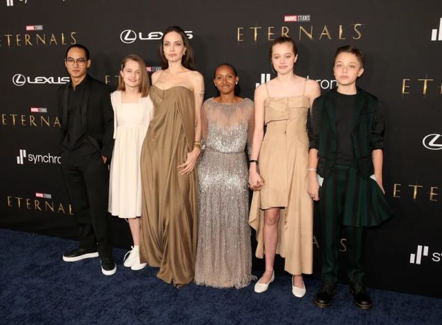朱莉与孩子们:Maddox、Vivienne、Zahara、Shiloh、Knox。双胞胎个头猛长,身高快要赶上妈妈的“四爷”Shiloh也穿上了和妈妈同色系的裙装。