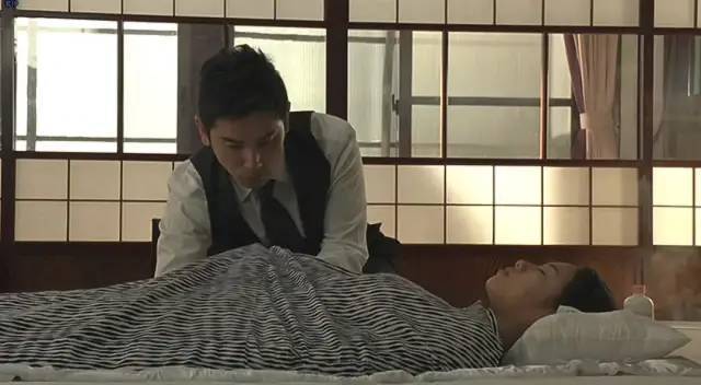 小林大悟静穆地跪坐在山下艳子的遗体前为老人施行最后的仪式。灵堂里,艳子的儿子山下一家和大悟的妻子美香一同见证了这场入殓。