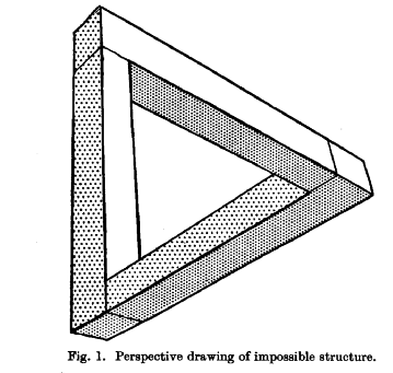 这一图形最早在1934年由由瑞典艺术家Oscar Reutersvärd创作而成,彭罗斯对这一令人眼花缭乱、带有视觉欺骗性的图形异常着迷,于是开始同父亲一起,在科学界和大众领域大力推广。最终,这个图形才获名为“彭罗斯三角”。