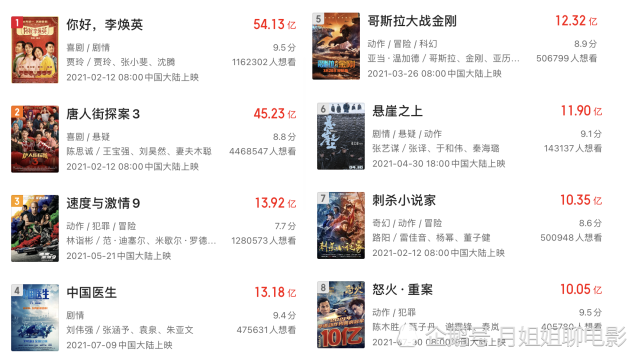 《怒火·重案》票房破了10亿之后,排在2021年票房榜单的第8名。排在前面是春节档电影《刺杀小说家》,票房成绩为10.35亿。