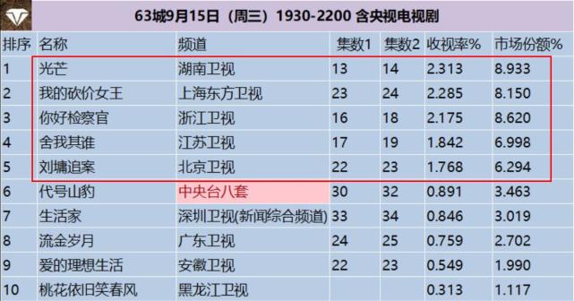 近日,从“63城”收视率数据显示可知,9月15日晚热播电视剧收视率排行榜前五分别如下: