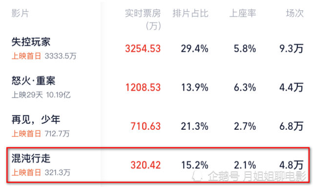 同期上映的《失控玩家》、《再见,少年》都获得了不错的首日票房成绩,《怒火·重案》仍旧有着十足的后劲。在这种情况下,《混沌行走》基本已经无法带来强大的冲击力。