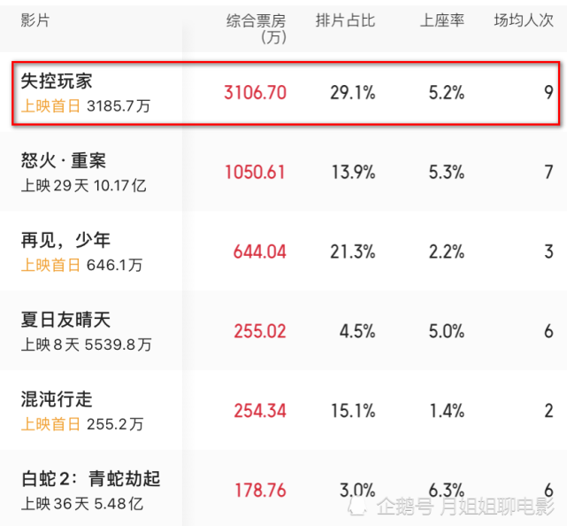 《失控玩家》首日票房轻松突破3000万,力压群雄,夺得了日票房冠军。今日上映了多部新片,但热度显然与之完全无法抗衡。