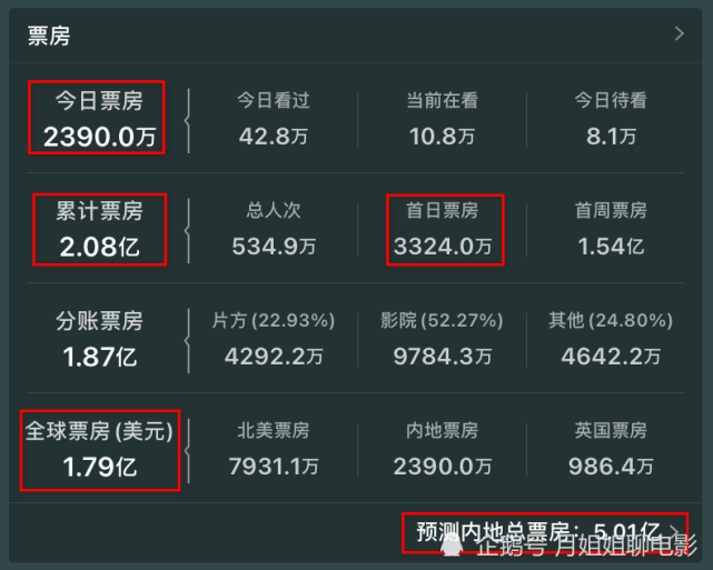 《失控玩家》累计票房突破2亿,可喜可贺!这部科幻喜剧片带来了超高的热度。排片量高达34.7%,上座位为3.8%,单日票房突破了2000万,夺得了单日票房冠军。该片由瑞安·雷诺兹主演,在票房突破2亿后,他手绘了破亿海报,画工感人。这部电影在猫眼上的预测票房已经突破了5亿,最终有很大希望实现。