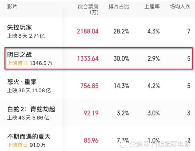《明日之战》的首日排片量高达30%,力压近期热映的《失控玩家》,《失控玩家》的排片量为28.2%,上座位为4.3%,夺得了上座率日冠。而《明日之战》的上座率仅为2.9%,低于热映的其他电影。