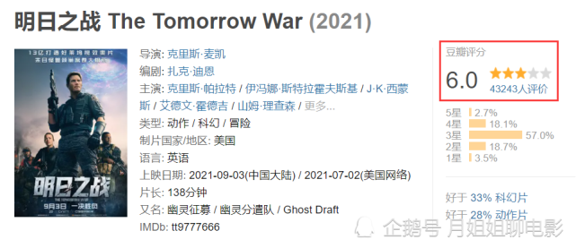 《明日之战》豆瓣评分为6分,勉强及格的分数。这部电影的演员演技在线,场面很壮观,尤其是战斗场面,“星爵”克里斯·帕拉特与怪兽之王的战斗,虽然无法势均力敌,但展现了英勇的一面。这也是该片最大的看点之一。