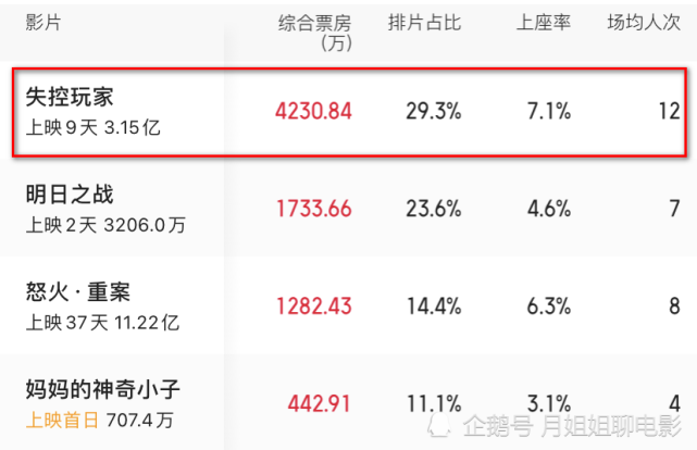 《失控玩家》的各项数据都排在了第一名,排片量高达29.3%,上座率达到了7.1%,单日票房超过了4000万。近期上映了不少新片,但新片的口碑都不如《失控玩家》。