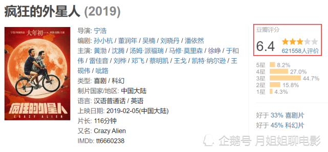 国产科幻喜剧片也有,但往往口碑一般,例如:在2019年宁浩执导的《疯狂的外星人》,豆瓣只有6.4分,该片由黄渤和沈腾主演,于和伟、雷佳音等人客串出演,可惜并没有获得绝大多数的观众认可。