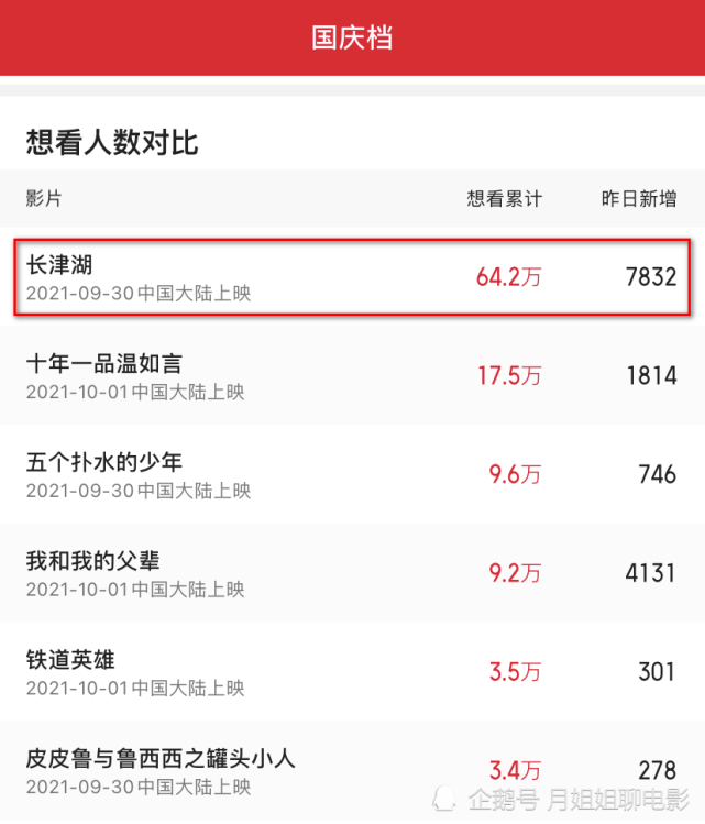 《长津湖》在发布第二个预告片后,热度再次提到了较大的提升,猫眼想看人数已经超过了64万,排在第一名,遥遥领先于其他国庆档电影。排在第二名的是《十年一品温如言》,排在第三的是《五个扑水的少年》,紧随其后的才是《我和我的父辈》和《铁道英雄》。