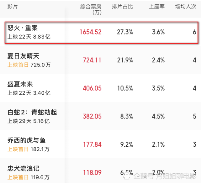 新片的上映让《怒火·重案》排片量跌破了30%,但影片的上座率达到了3.6%,场均人次达到了6,排在第一名。