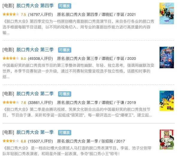 如果我们把四季脱口秀大会的豆瓣评分拿出来比一比,会发现一个很有趣的现象,去年是分数最高的一年,我私以为,这很大一部分原因要归结于杨笠的爆炸效果和她引发的巨大话题效应。