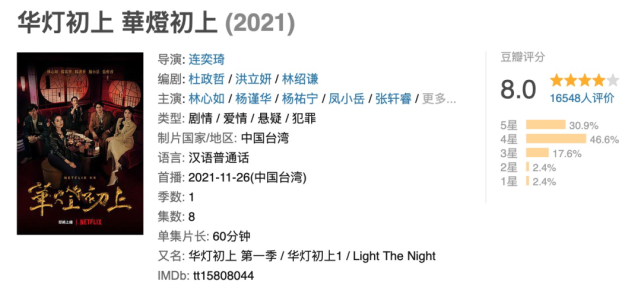 林心如担任制片人和主演的一部新剧,早早被网飞以3亿新台币拿下版权,24集的体量分成了三季,从目前第一季播完的情况来看,豆瓣评分停在了8.0分。