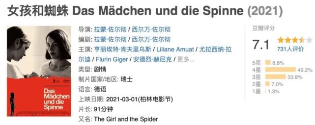夹在一堆大导的话题作之间,有一部来自瑞典的小众影片——《女孩和蜘蛛》,低调的位列第八。